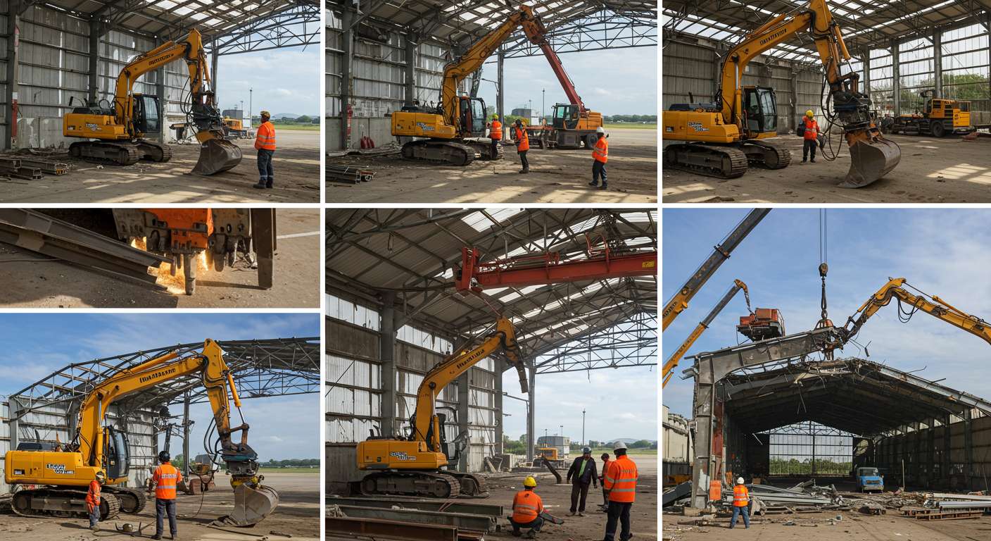Для демонтажа ангаров применяется широкий спектр инструментов и спецтехники. Экскаваторы с гидравлическими ножницами и молотами позволяют разрезать балки и фермы, автокраны и манипуляторы — поднимать и перемещать крупные элементы, а подъемные платформы обеспечивают доступ к верхним частям конструкции. Для точной резки используются газовые и плазменные резаки, алмазные диски и механические ножницы. В некоторых случаях применяются роботизированные комплексы, которые позволяют дистанционно выполнять опасные операции и уменьшить участие человека в зоне повышенного риска.
